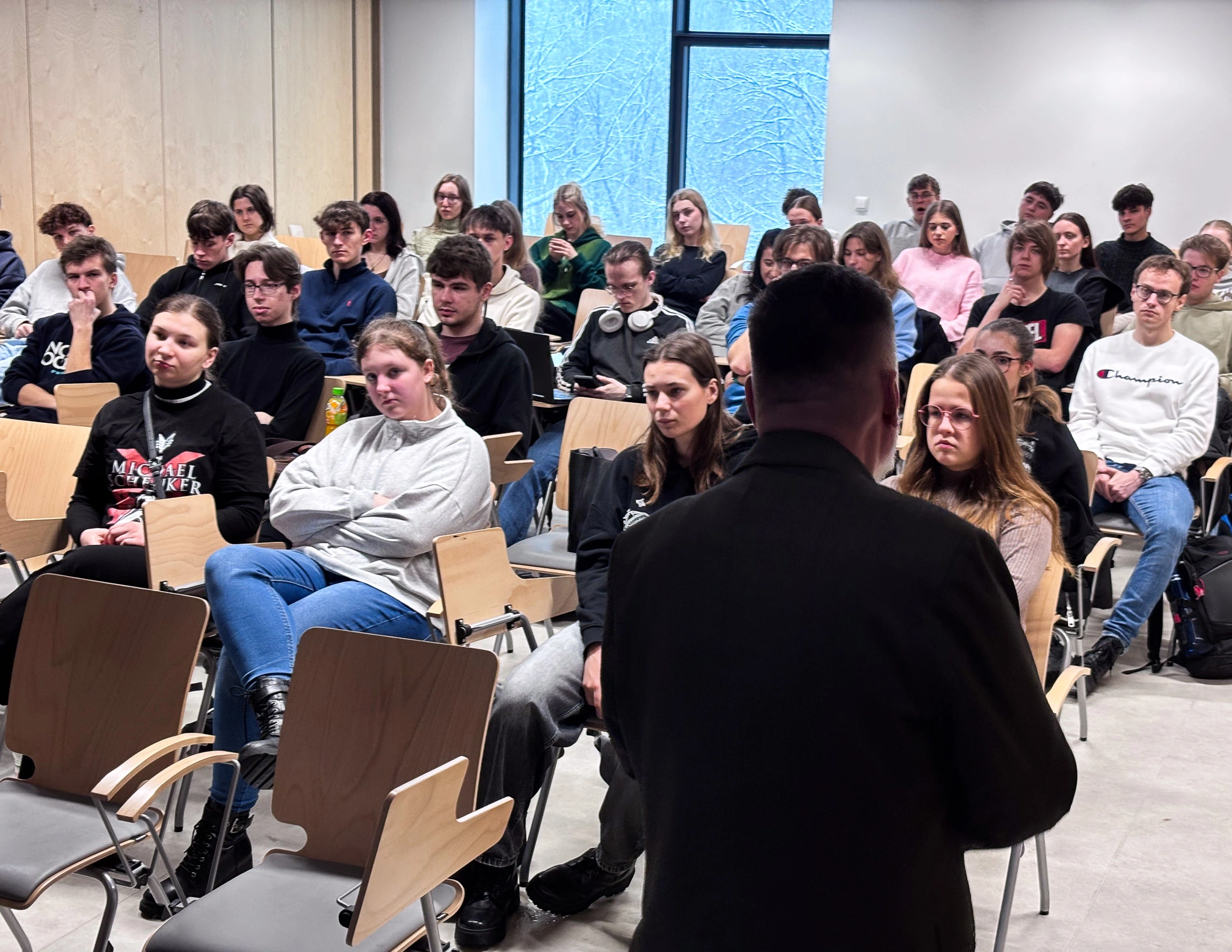 Spotkanie miało charakter otwarty — studenci chętnie włączali się do dyskusji i zadawali dociekliwe pytania, wykazując duże zainteresowanie zarówno praktycznymi aspektami służby, jak i ścieżkami rozwoju zawodowego.