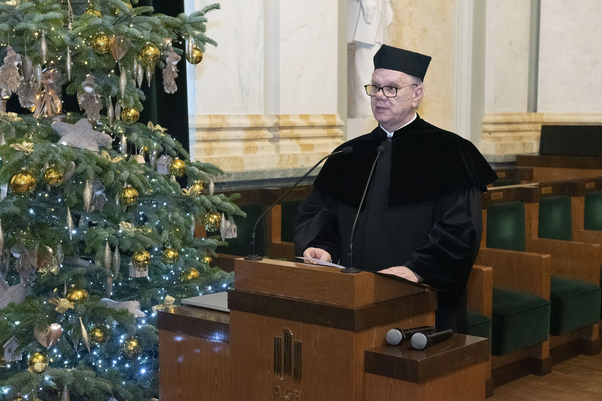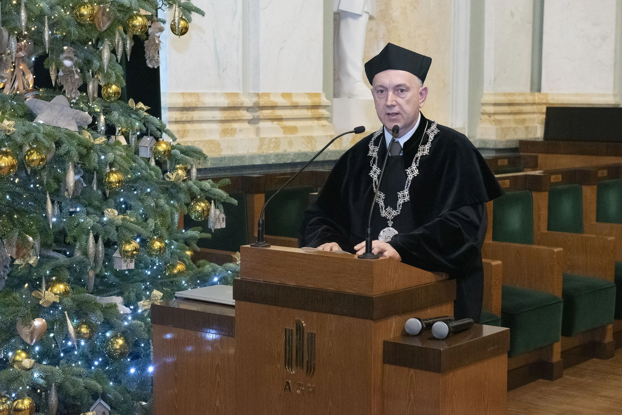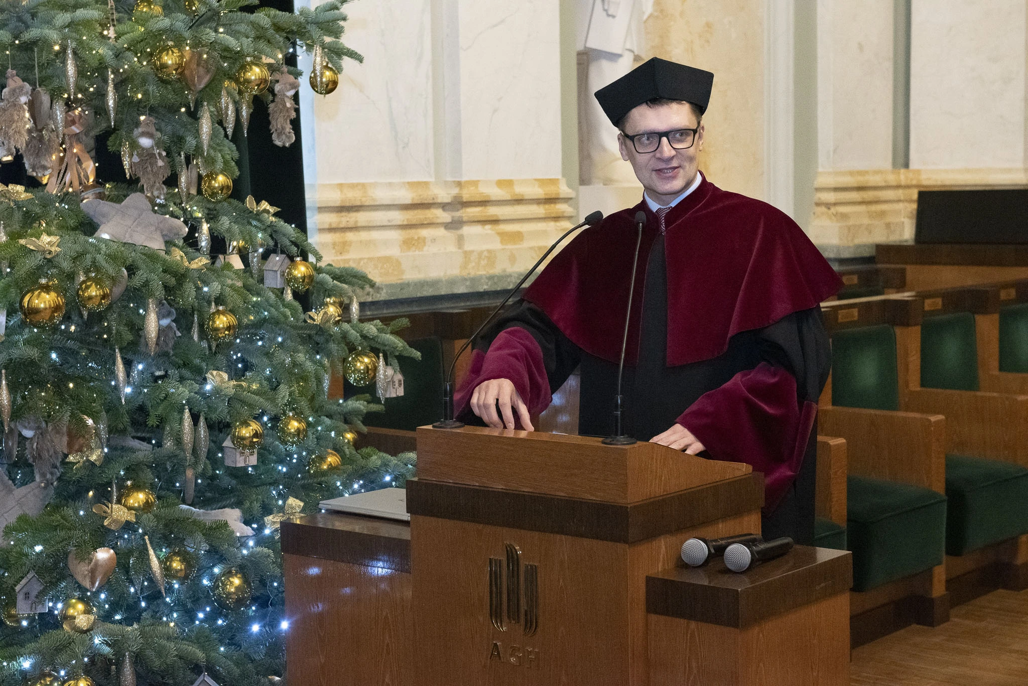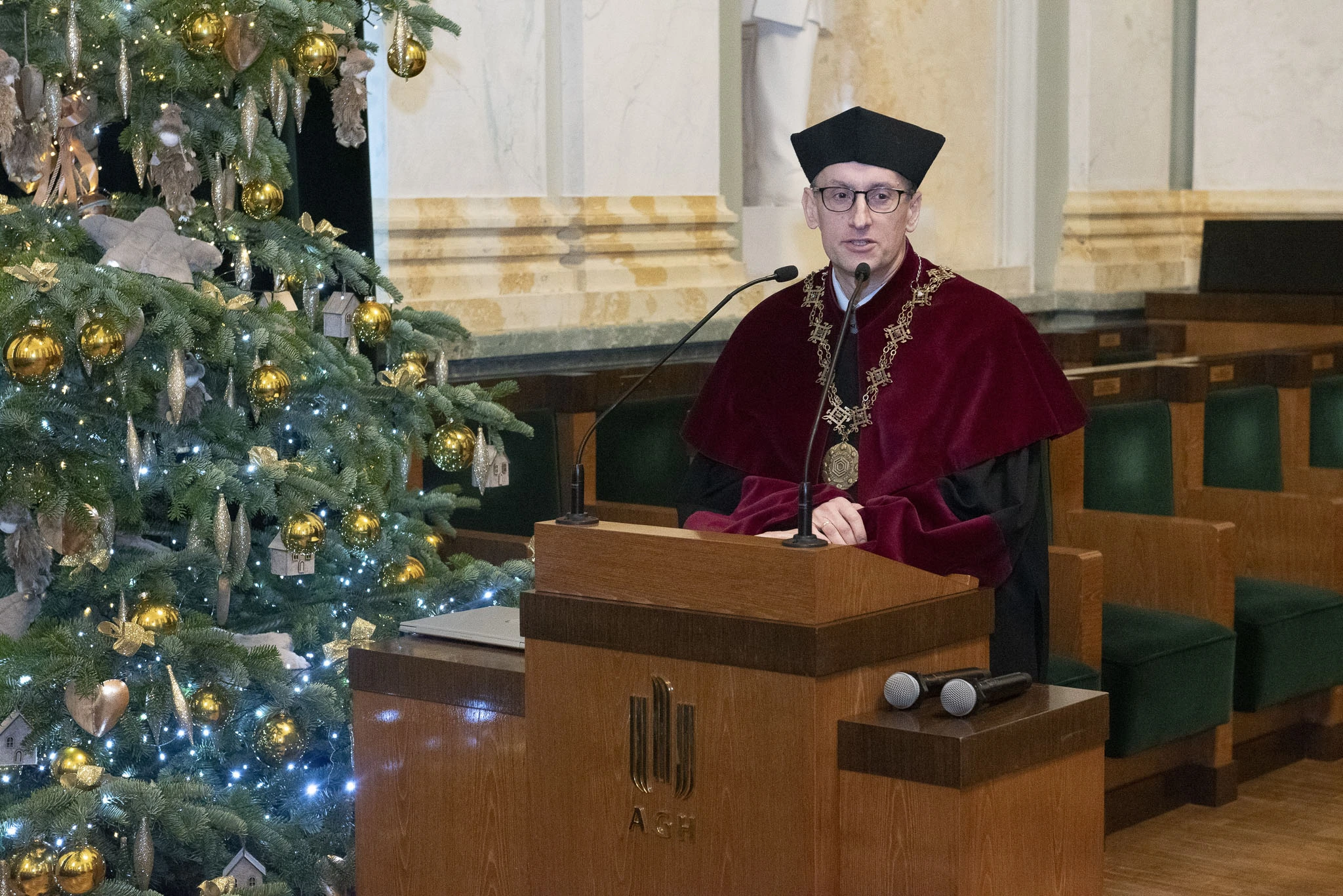 Uroczystość poprowadził Prorektor ds. Kształcenia prof. Krzysztof Mendrok, który powitał absolwentów wraz z ich rodzinami i bliskimi, a także przedstawicieli władz dziekańskich. W swoim wystąpieniu podkreślił wyjątkowy charakter wspólnoty akademickiej, przypominając, że uniwersytet — zgodnie z wielowiekową tradycją — jest wspólnotą nauczających i uczących się. Zwrócił uwagę na znaczenie podtrzymywania więzi z Alma Mater oraz wyraził nadzieję, że słowa „Jestem z AGH” pozostaną dla absolwentów ważnym elementem tożsamości i powodem do dumy. Na zakończenie zapewnił, że drzwi Akademii zawsze pozostaną dla nich otwarte, życząc sukcesów zawodowych, osobistych i niegasnącej pasji poznawczej.